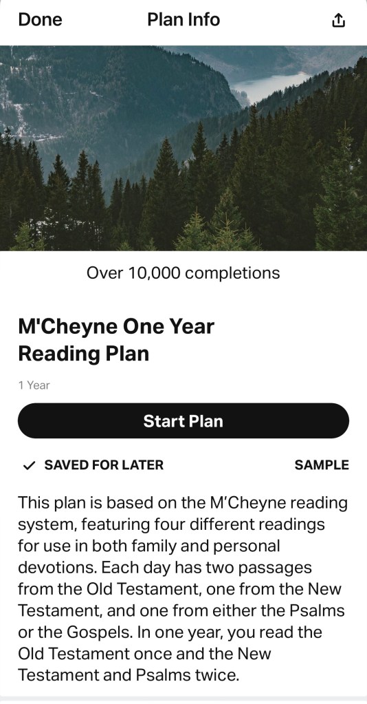 Choose a reading plan – it can be 365 Day read through the Bible plan, or choose several throughout the year. The goal is to read the Bible every day in 2023. Tom and I are using the You Version app and have selected M’Cheyne One Year Reading Plan. (See the bottom of this post for a link to this plan.)